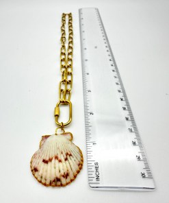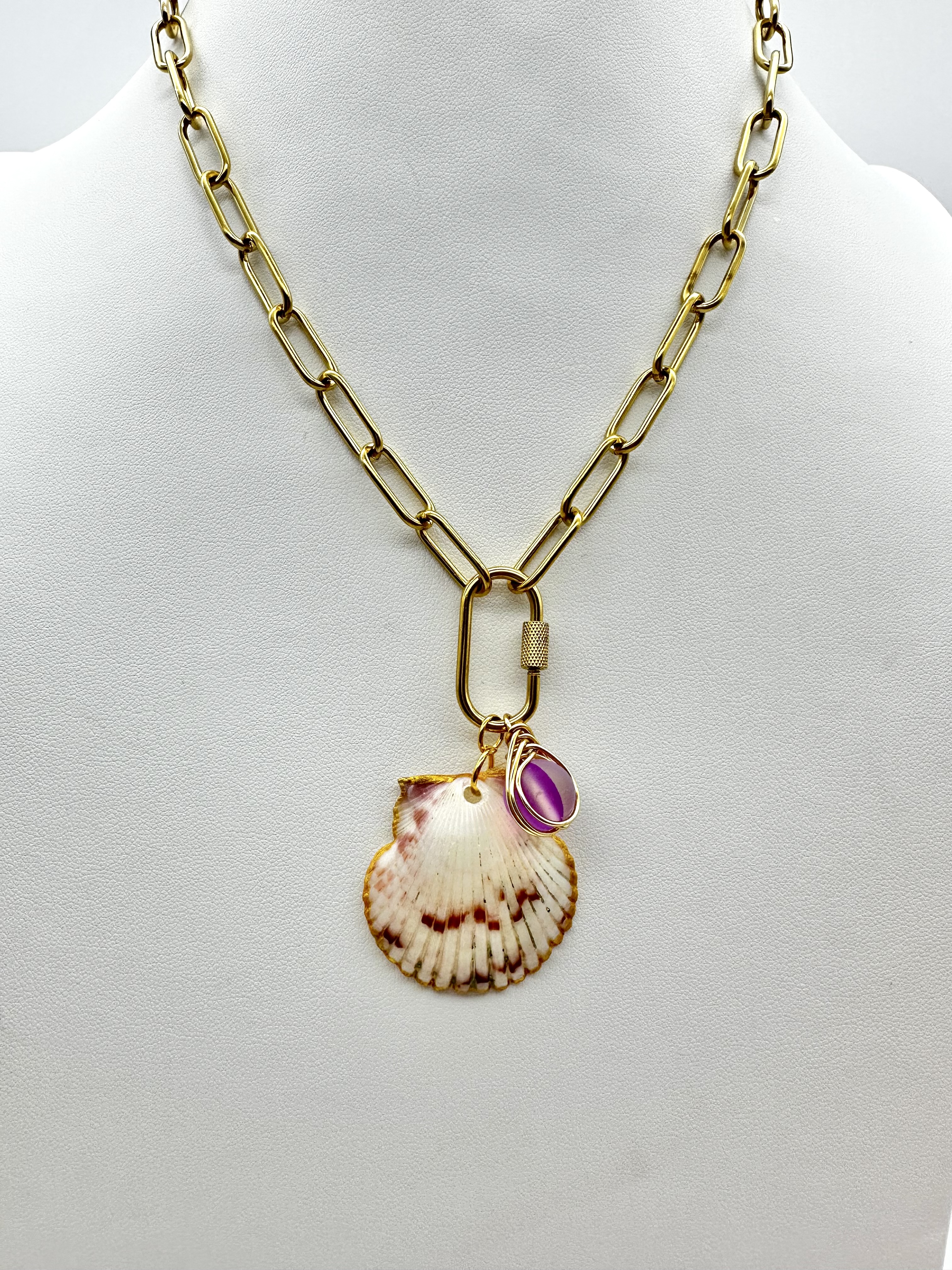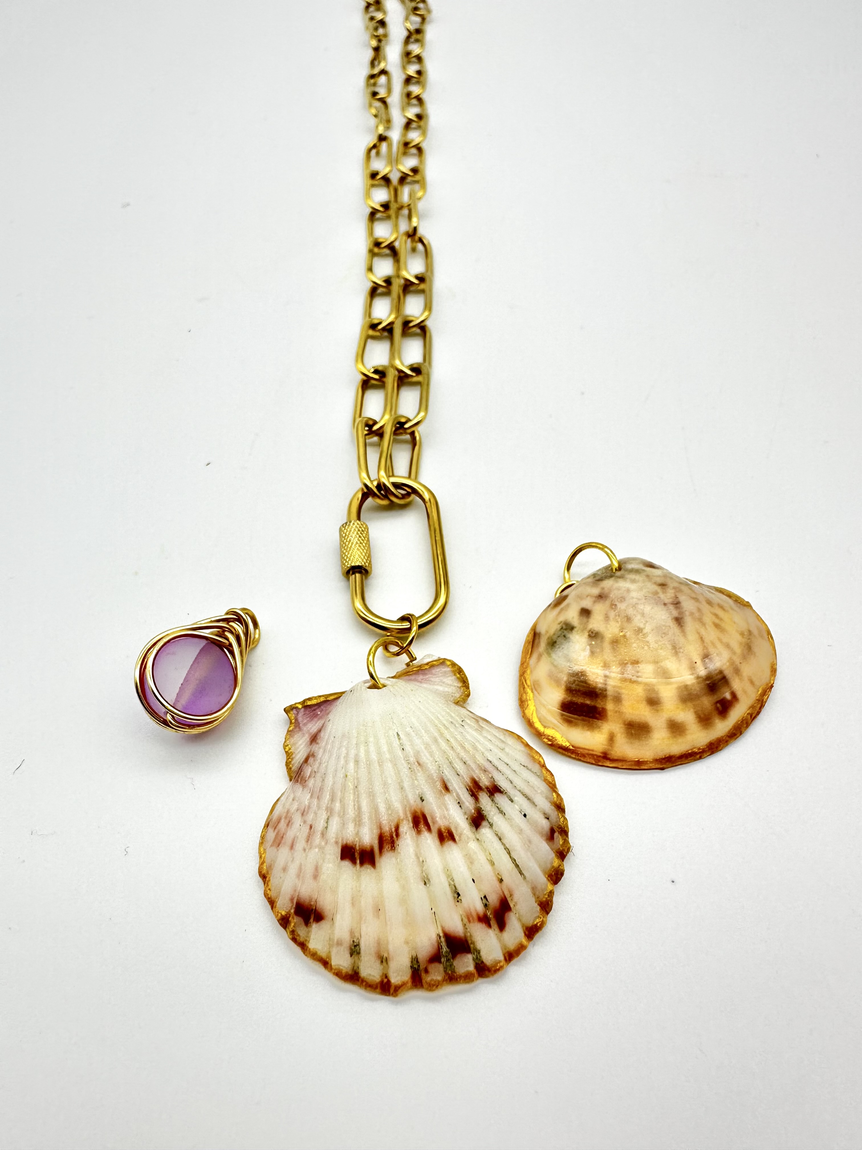 Gold plated, stainless steel 18-inch carabiner charm necklace. Includes a black Atlantic scallop and a calico clam seashell charms from St. Augustine beach, and a wire-wrapped gem charm. Save by purchasing this charm bundle! If purchased separately, these items cost $35.00. Wear any combination of charms to create your custom look.