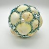 A decorative ball made of genuine St. Augustine Florida seashells. This ball contains black and grey scallop seashells with faux pearls and gold tone accents. Stand it on its own or place in a bowl with other decorative balls.