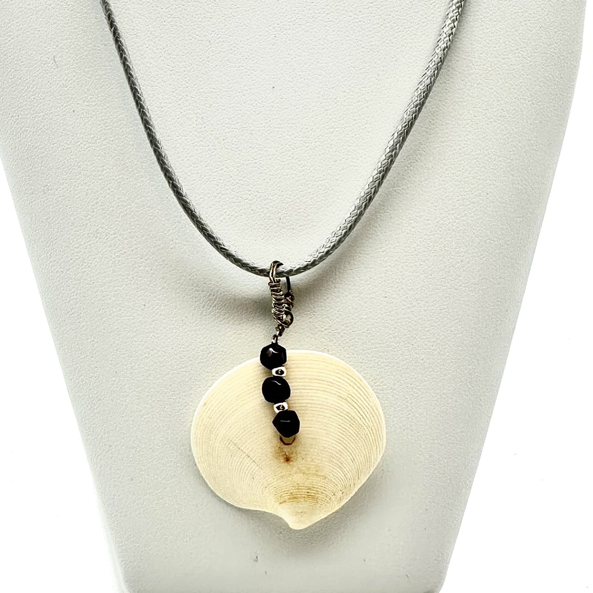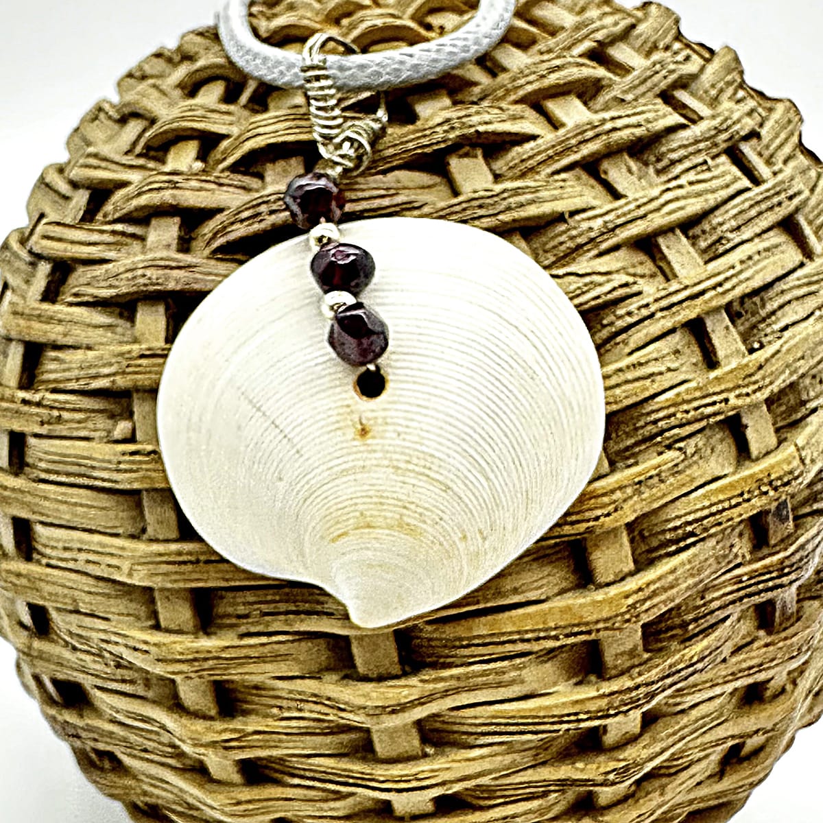 Bivalve cream and white Florida seashell accented with faceted natural garnet and silver tone beads. 18-inch grey waxed cord with lobster claw clasp included.