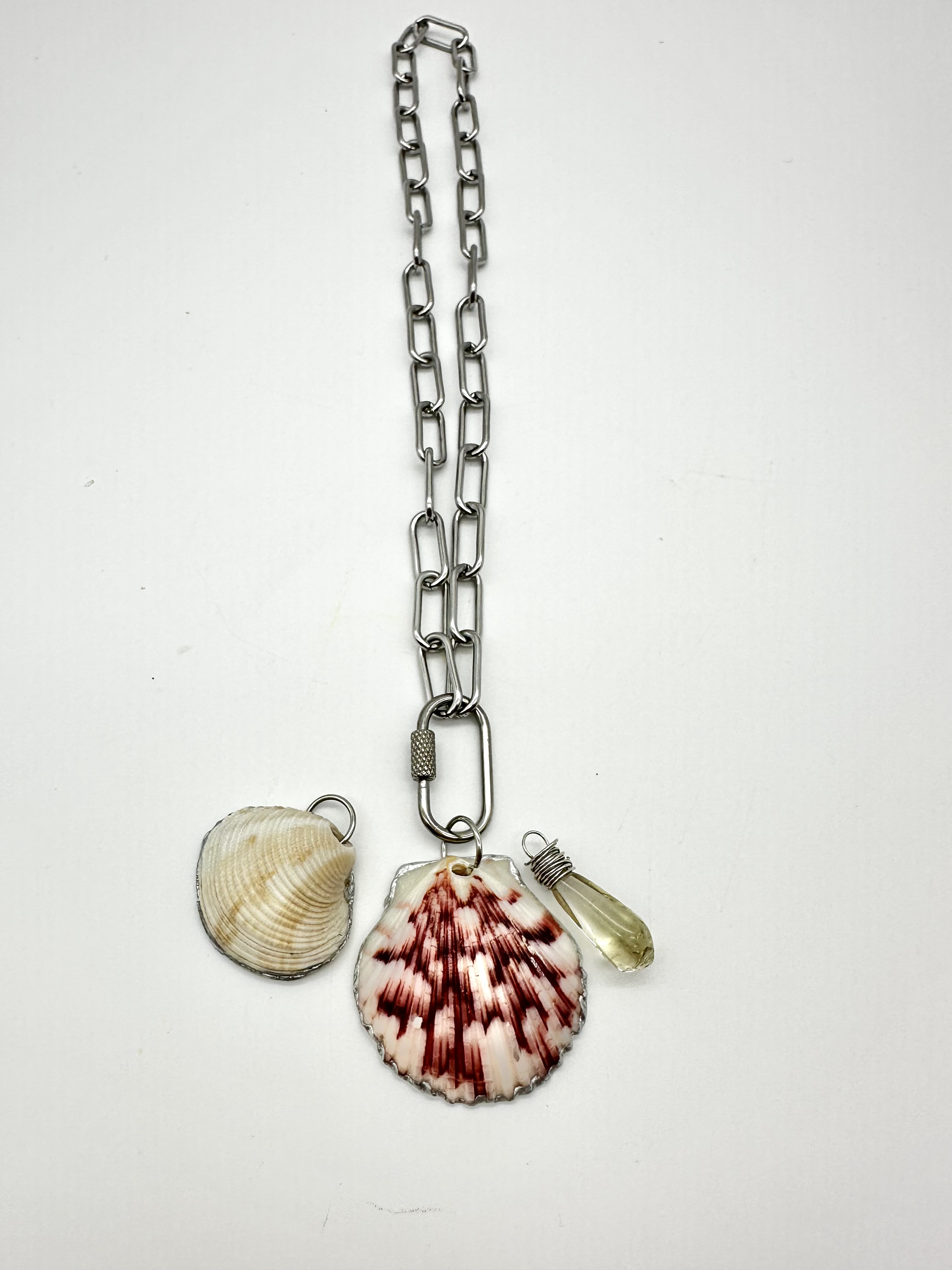 Silver plated, stainless steel 16-inch carabiner charm necklace. Includes a calico Atlantic scallop and a clam shell charm from St. Augustine beach, and a wire-wrapped smoky quartz charm. Save by purchasing this charm bundle! If purchased separately, these items cost $35.00. Wear any combination of charms to create your custom look.
